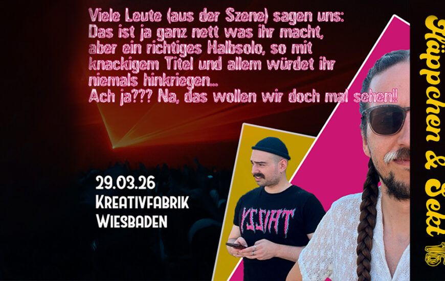 Die wiederkehrende Comedy-Show HÄPPCHEN & SEKT mit Lukas Diestel und Jonathan Löffelbein, den Machern von Worst of Chefkoch. „Häppchen & Sekt ist besonders und witzig und schön. Ganz ehrlich: Kommt einfach hin.“