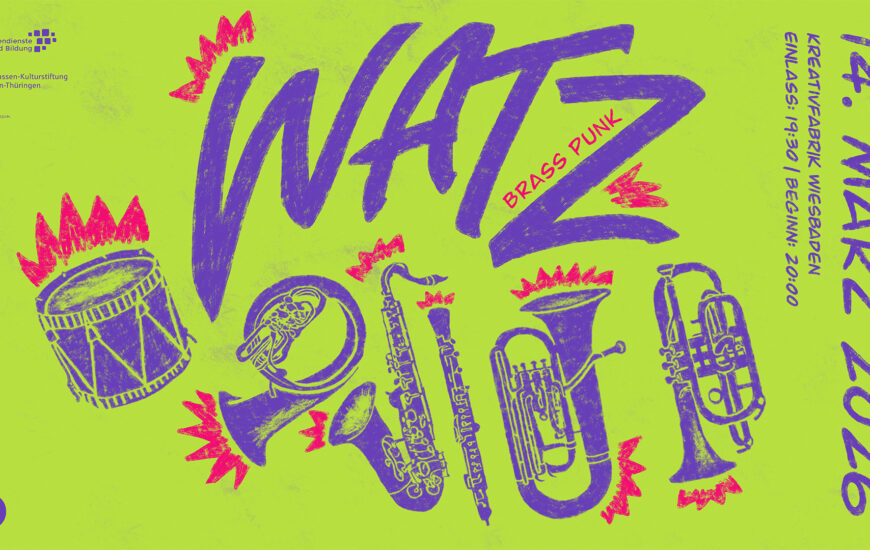WATZ sind eine Band aus aktuell neun Menschen, jeder Menge Blech- und Holzblasinstrumenten und Drums. Zwischen Melodien und Gebratze, mal lau, mal leiser, ein wilder Chaos-Mix aus Brass, Punk, Elektro, Pop, Disco quer durch die Galaxie.