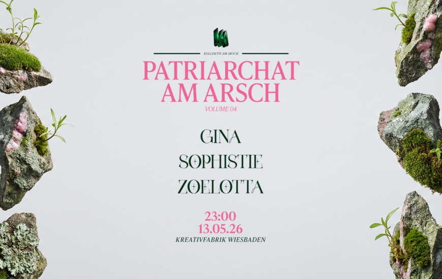 PATRIARCHAT AM ARSCH VOLUME 4 IS CALLING! Am 13.05. eröffnet euch Kollektiv am Arsch erneut seine antipatriarchalen Pforten in der Kreativfabrik, wo die Artists Gina, Sophistie und Zoelotta den Ton angeben und feinste elektronische Musik schmettern werden.