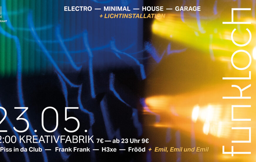 Das FUNKLOCH geht in Phase 5 und hat wieder ein elektrisierendes Line Up zusammengestellt, das euch gepflegt den Stecker ziehen wird! Neben euren House-Elektrikern Frööd und Frank Frank stehen dieses Mal DJ Piss In Da Club und H3XE bereit, um eure Dynamos zum Glühen zu bringen und eure Tanzbeine mit ordentlich kinetischer Energie zu versorgen!