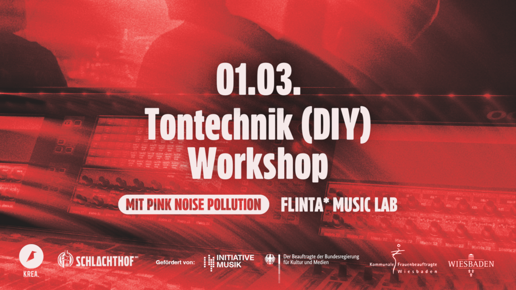 Der Workshop wird geleitet von PINK NOISE POLLUTION: “Wir sind eine queerfeministische, nichtkommerzielle DIY Event Tech Crew mit Fokus auf mehr Diversität hinterm Mischpult. Wir bieten Workshops, Skillsharing und technische Unterstutzung für selbstorganisierte Veranstaltungen und Demos.”