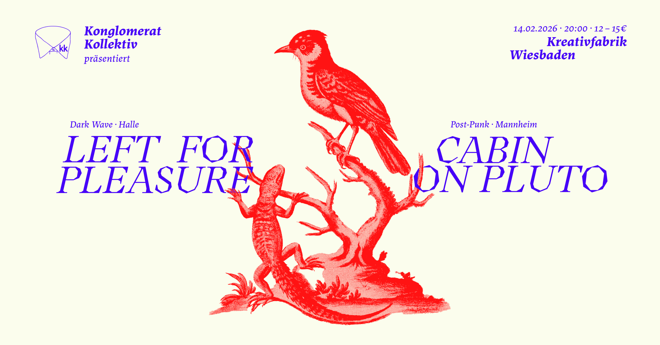 Konglomerat Kollektiv präsentieren ein Konzert mit LEFT FOR PLEASURE, Dark Wave EBM aus Halle, und CABIN ON PLUTO, die Postpunk mit Noiserock kreuzen.