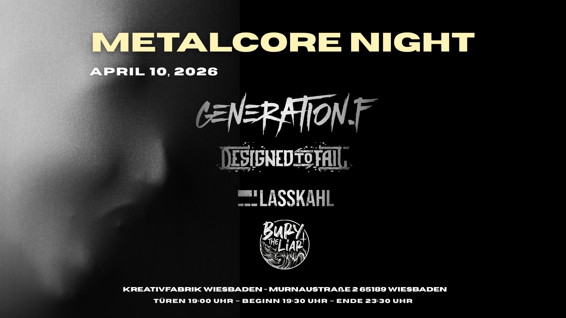 Metalcore Fans aufgepasst, Generation.F, Designed to Fail, Lasskahl und Bury the Liar präsentieren das perfekte Abend-Programm für alle Breakdown Enthusiasten und blegh Begeisterten.